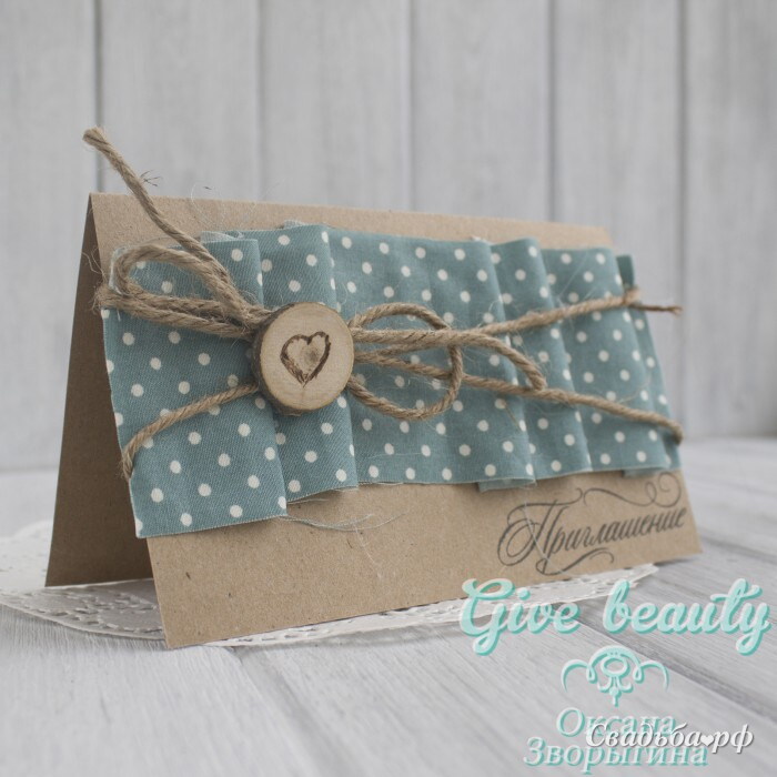 Приглашение для свадьбы в стиле рустик. Размер 10*15 см. Выполнено из плотного крафт-картона, ткани, бечёвки и среза дерева.