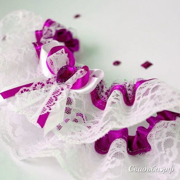 Красивая пышная подвязка выполнена из кружева и атласных лент. Дополнена стразами по центру.