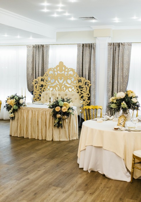 VIP-зал до 15 человек. Интерьер зала выполнен в русском стиле. Лепнина и бра на стенах создают ощущение роскоши.