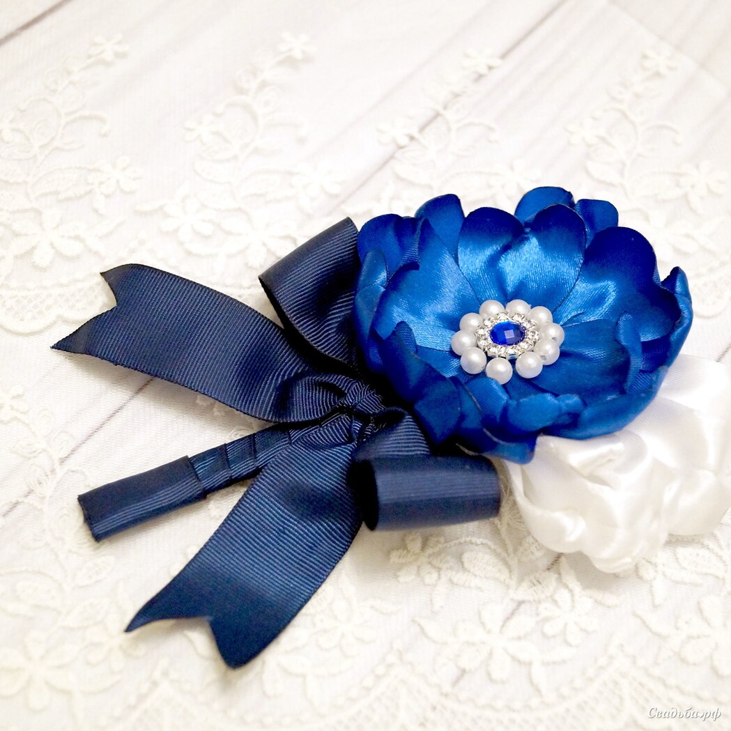 Бутоньерка с раскрывшимся цветком тюльпана синего цвета и двумя бутонами белого цвета. Выполнена из атласных лент и репсовой ленты темно-синего цвета. Задекорирована бусинами белого жемчуга и стразами.