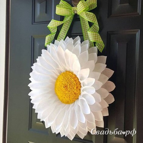 Пышный и праздничный цветок белой ромашки/хризантемы выполнен из фетра белого и желтого цветов. Украшен широкой атласной лентой. Цветок выполняется на заказ. Срок выполнения заказа от 14 до 20 дней. При меньшей загруженности возможно и раньше.